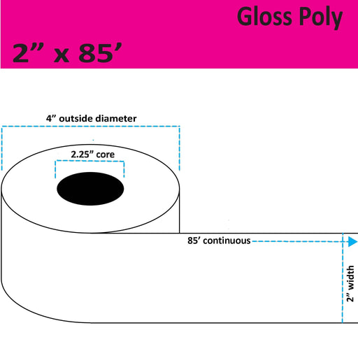 2" x 85' Continuous Gloss Poly Inkjet Label - 12 Rolls per Case - 2.25" Core - 4" Outer Diameter - No Perfs.