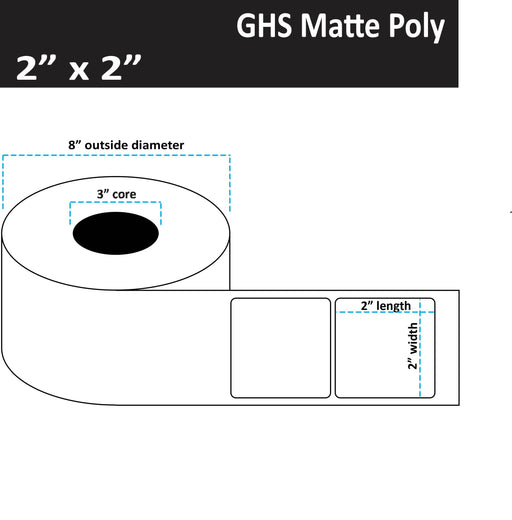 2" x 2" Matte Poly Inkjet Label - GHS / BS5609 Certified - 2,250 per Roll - 8 Rolls per Case - 3" Core - 8" Outer Diameter - No Perfs.