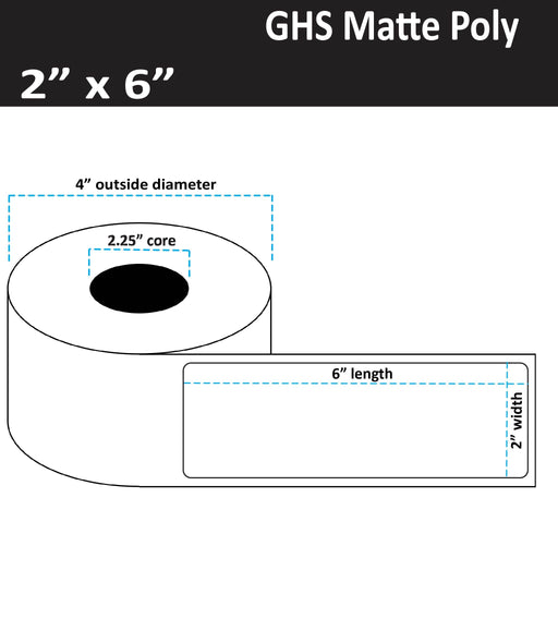 What's in the box? 1 Case of 2" x 6" Matte Poly Inkjet Label - GHS / BS5609 Certified - 150 per Roll - 8 Rolls per Case - 2.25" Core - 4" Outer ...