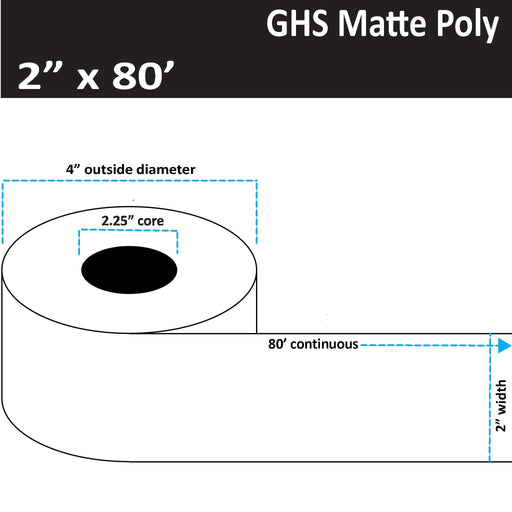 2" x 80' Continuous Matte Poly Inkjet Label - GHS / BS5609 Certified - 12 Rolls per Case - 2.25" Core - 4" Outer Diameter - No Perfs.