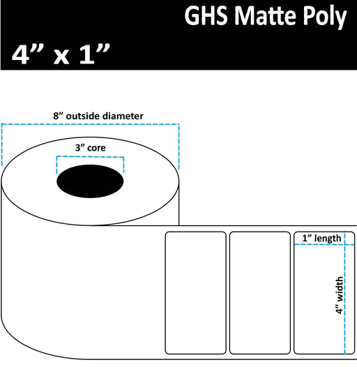 What's in the box? 1 Case of 4" x 1" Matte Poly Inkjet Label - GHS / BS5609 Certified - 800 per Roll - 8 Rolls per Case - 2.25" Core - 4" Outer ...