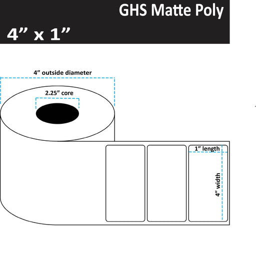 View full details4" x 1" Matte Poly Inkjet Label - GHS / BS5609 Certified - 800 per Roll - 8 Rolls per Case - 2.25" Core - 4" Outer Diameter - No Perfs.
