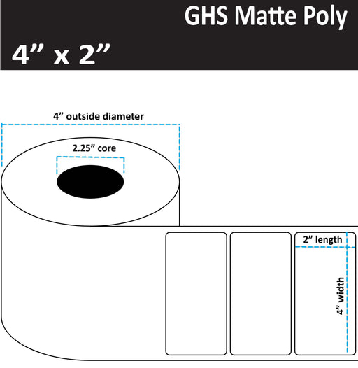 What's in the box? 1 Case of 4" x 2" Matte Poly Inkjet Label - GHS / BS5609 Certified - 400 per Roll - 8 Rolls per Case - 2.25" Core - 4" Outer ...